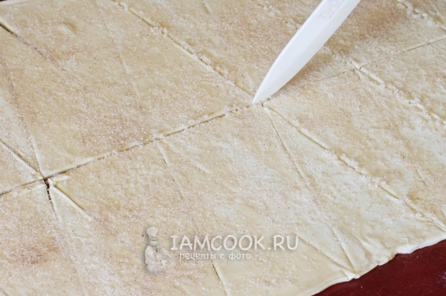 Сахар перемешайте с молотой корицей, равномерно посыпьте тесто приготовленной смесью. Я слегка прошлась еще раз по тесту скалкой, чтобы сахар вдавить в тесто, и еще раз - острием ножа по линиям разреза.
