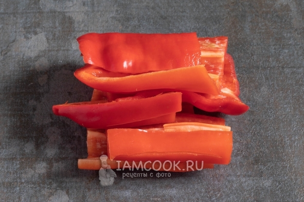 Красный сладкий перец режем на очень крупные куски (так, чтобы умещались в тару с крышкой, которую вы сможете поставить в микроволновку).