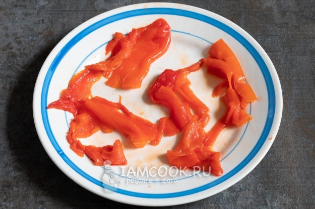 Запекаем куски перца в закрытой ёмкости в микроволновой печи на максимальном режиме, пока не окажется, что у них начала легко отделяться тонкая наружная кожица. У меня заняло 6 минут на мощности 800 Вт, но имейте в виду, что перцы бывают разными. Просто знайте, что такая стадия готовности у них существует. Если вы не используете микроволновку, то можно запечь перцы в духовке - как для приготовления лечо.