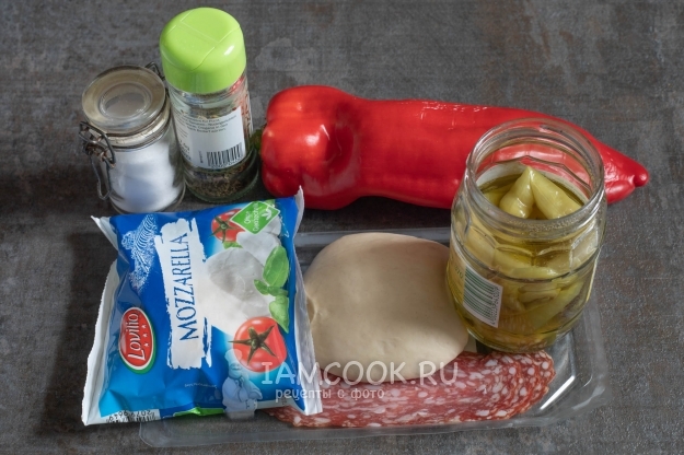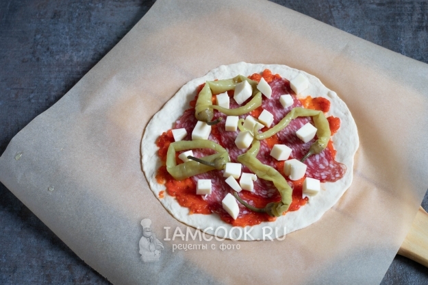 Смазываем тесто для пиццы соусом из красного сладкого перца, выкладываем колбасу, сыр и маринованные перцы.