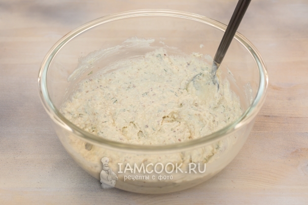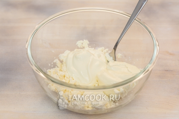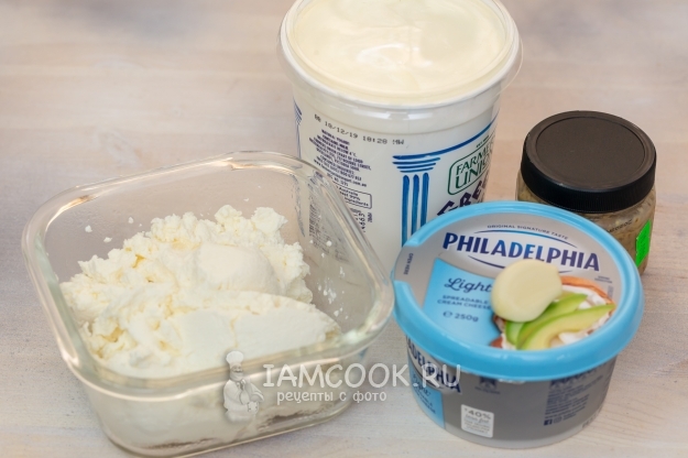 Смешайте в миске творог, сливочный сыр и сметану (йогурт).