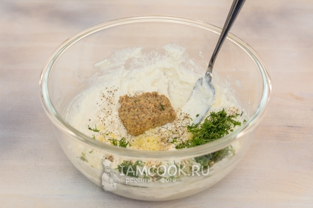 Добавьте натертый на мелкой терке чеснок, соль и перец, нарезанный мелко укроп и зернистую горчицу.