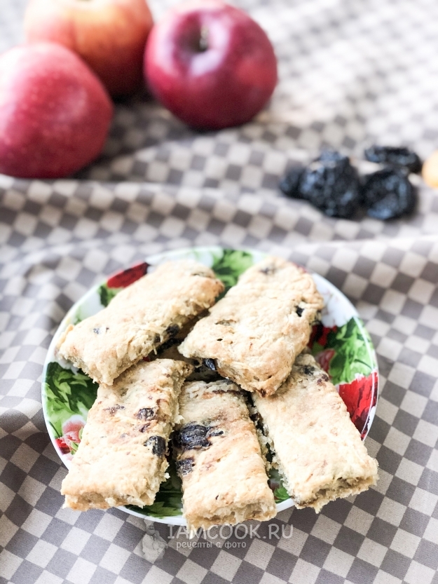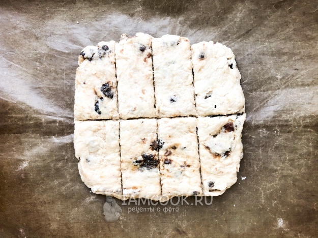 Противень застелите пергаментной бумагой. Из теста сформируйте прямоугольник высотой не выше 1 сантиметра и разрежьте на 8 равных частей. Выпекайте 30 минут в духовке при температуре 180 градусов.