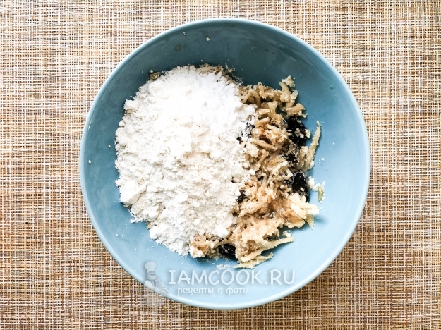 Добавьте муку, растительное масло, разрыхлитель и тщательно перемешайте.