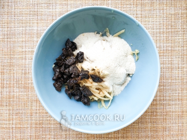 Яблоко очистите и натрите на крупной терке. Добавьте мелко нарезанный чернослив и манку. Перемешайте и отправьте в холодильник на 30 минут.