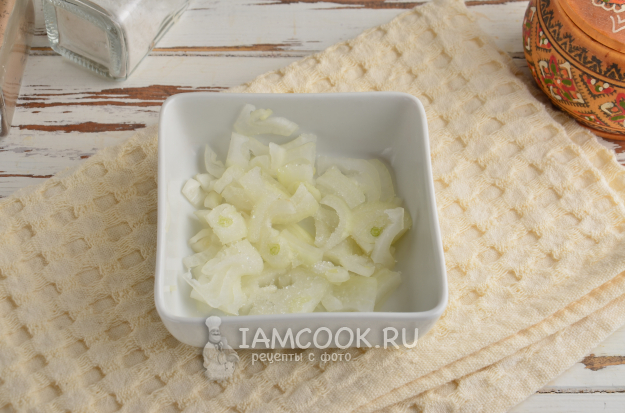 Замариновать репчатый лук очень просто. Очищенную луковицу нарежьте соломкой или четверть-кольцами. Сложите лук в пиалу, добавьте сахар и натуральный яблочный уксус. Перемешайте и помните руками лук, оставьте на 15 минут.