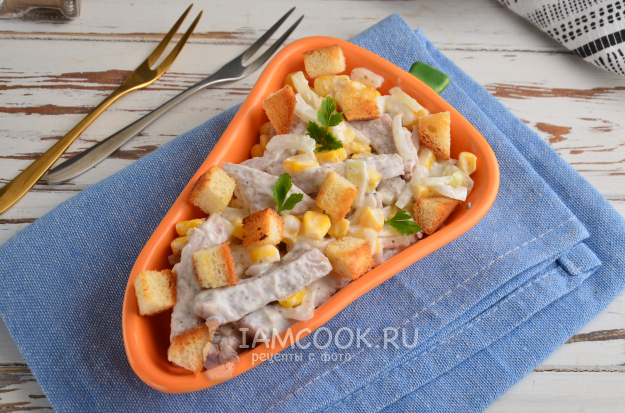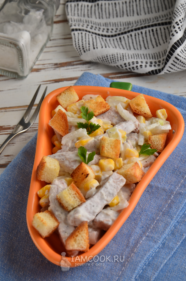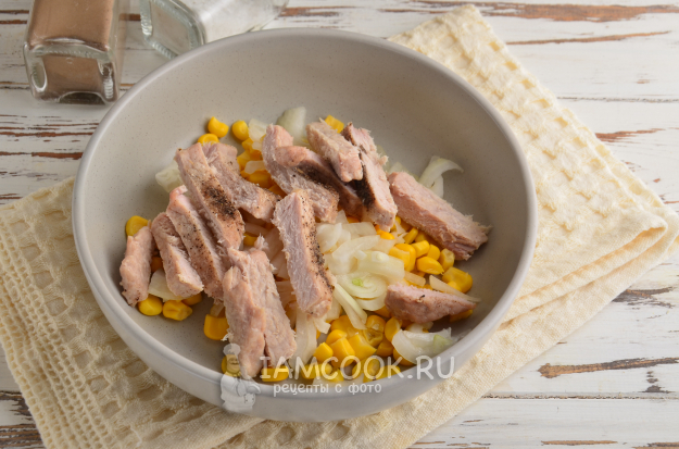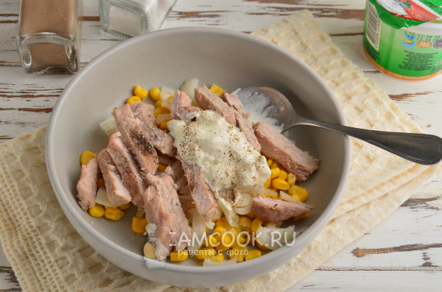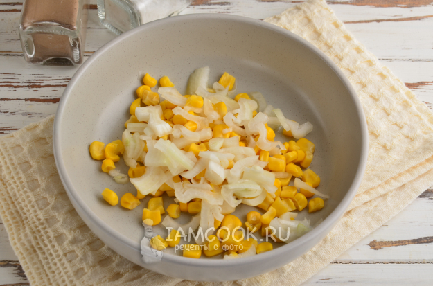В салатник положите консервированную кукурузу. Маринованный лук промойте от излишков сахара и уксуса, отожмите и положите в салатник.