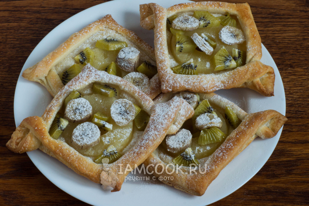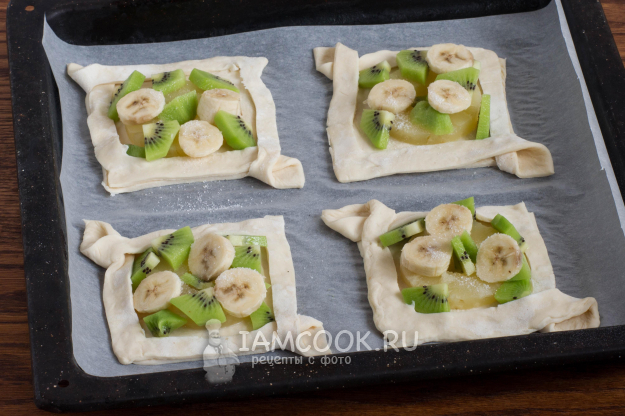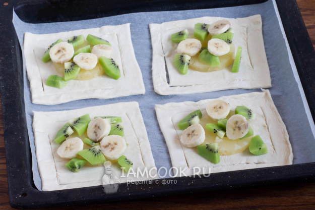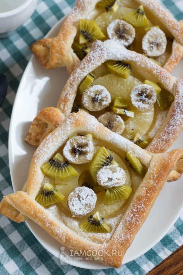 Слойки с фруктами можно готовить не только с ананасами, киви и бананом. Можно использовать фрукты более доступные, по сезону. Данные слойки будут с некоторым экзотическим акцентом.