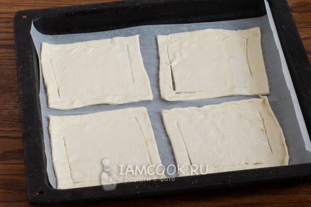 Разморозьте тесто и разверните на столе, присыпанном мукой. Немного раскатайте пласт. Вырежьте квадраты размером на 2-3 см больше диаметра ананасов (с каждой стороны). У меня получилось 8 квадратов со стороной 13 см. Выложите заготовки на противень, застеленный пергаментной бумагой. Сделайте на каждом квадрате угловые надрезы буквой Г, надрезы не должны соединяться.