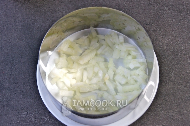 Для начала нарежьте помельче репчатый лук и обдайте кипятком, чтобы ушла лишняя горечь. Сварите яйца вкрутую, остудите, очистите.