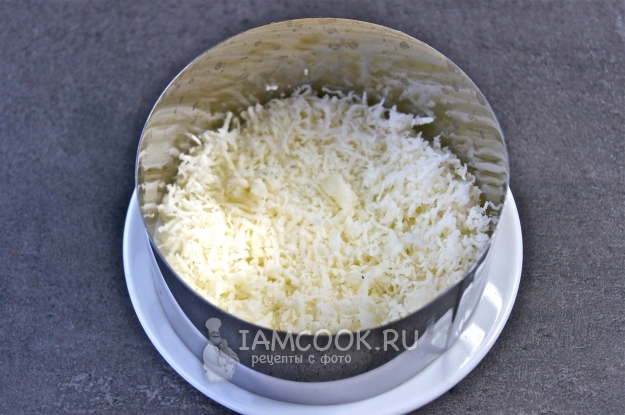 Затем выложите натертый на мелкой терке сыр, смажьте майонезом.