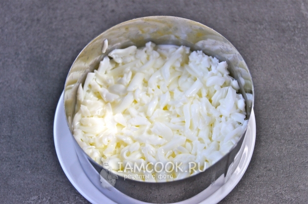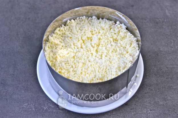 Отделите белки от желтков, натрите белки на крупной терке и выложите на майонез.