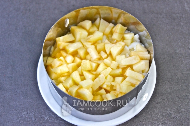 Яблоко очистите, удалите сердцевину, нарежьте на маленькие кусочки, выложите на белки.