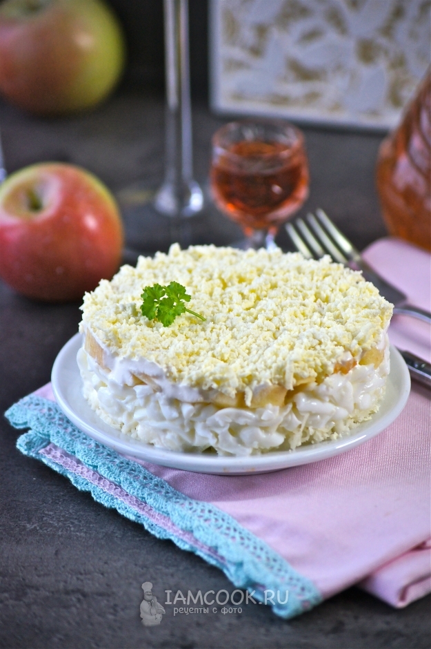 Салат «Нежность» с яблоком, яйцами и сыром готов.