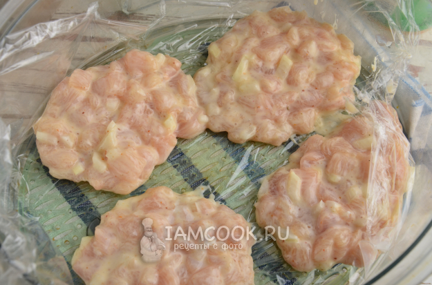 Форму для варки на пару нужно застелить пищевой пленкой. Ложкой выложите небольшие порции рубленого фарша. Закройте емкость крышкой и варите рубленые куриные котлеты на пару в течение 30-35 минут.