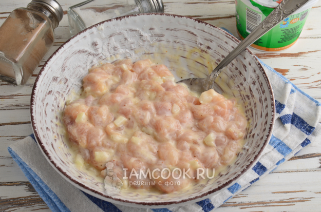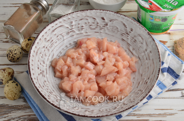 Куриное филе помойте, обрежьте все лишнее - пленки и жир. Острым ножом нарежьте филе на очень маленькие кусочки, чтобы рубленый фарш получился максимально однородным.