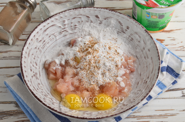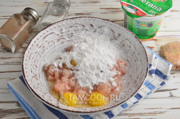 Вбейте в миску с мясом перепелиные яйца. Это количество яиц можно заменить одним куриным яйцом среднего размера. Также насыпьте в миску картофельный крахмал.