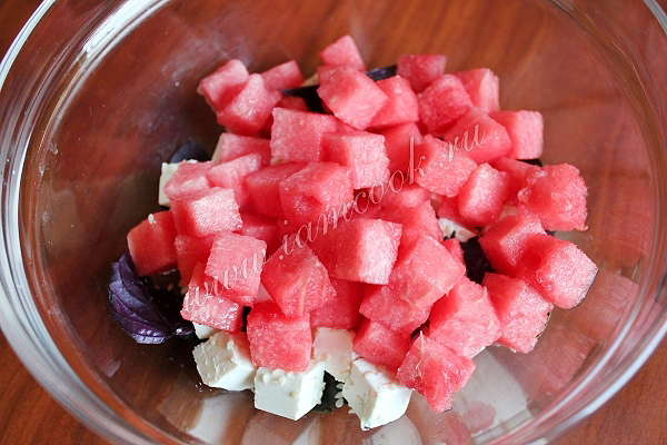 Подготовьте для салата ингредиенты в таком соотношении: одна часть феты к двум частям мякоти арбуза.