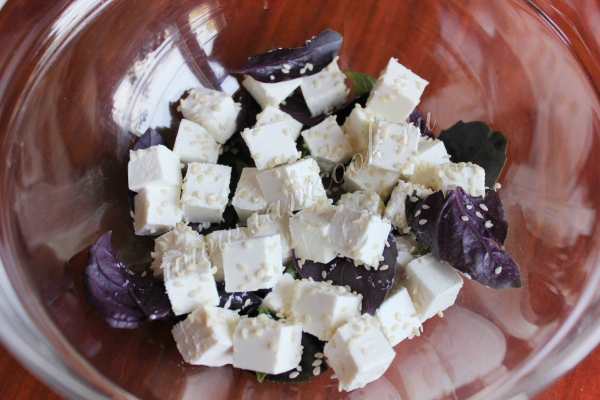 В салатник бросьте листочки базилика и, по желанию, мяты. Добавьте фету и посыпьте её подсушенными семенами кунжута, можно и без кунжута ...