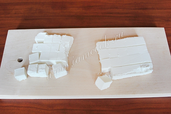 Нарежьте фету кубиками ножом или кружочками порцевателем.