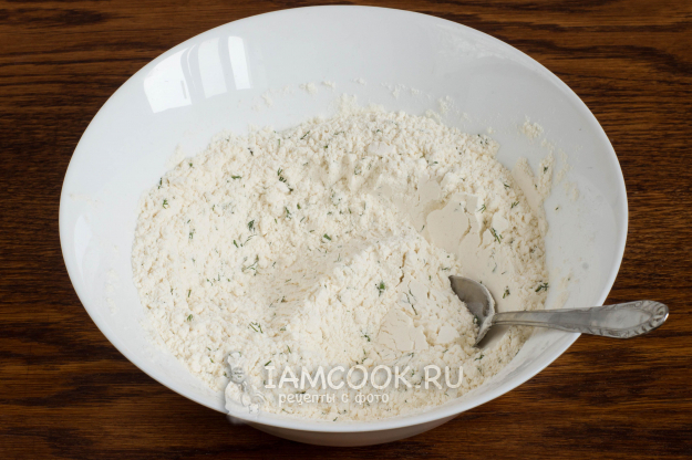 Муку соедините с разрыхлителем, солью, перцем, сахаром, тимьяном и мелко нарезанной зеленью. Перемешайте.