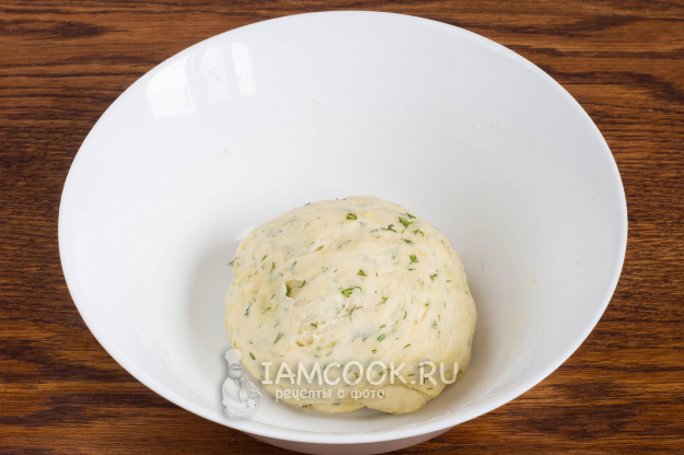 Добавьте растительное масло, перемешайте. По частям добавляйте теплую воду, замешивая тесто. Должно получиться гладкое, не липнущее к рукам, немного тугое тесто. Накройте его полотенцем и отставьте в сторону на 10-15 минут.