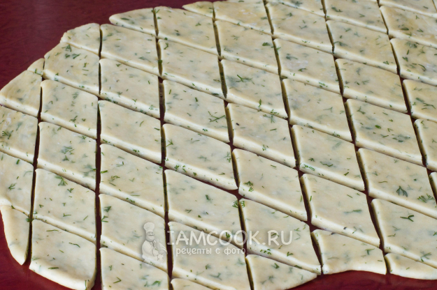 Раскатайте тесто в пласт толщиной примерно 3-4 мм (поверхность я мукой не присыпала, тесто не прилипает). Нарежьте пласт на небольшие крекеры произвольной формы.