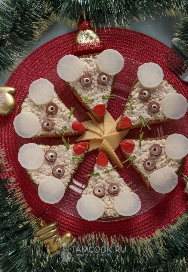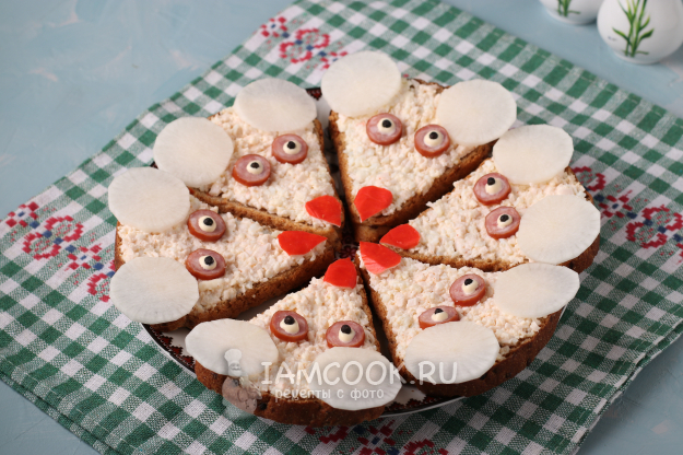 Предлагаю вам оригинальные бутерброды в форме мышек для праздничного стола на Новый год. Довольно часто для бутербродов я покупаю нарезной хлеб в форме треугольника, и у меня родилась идея, как сделать именно бутерброды "Мышки". Изначально уши планировалось сделать из развёрнутых крабовых палочек, но примерив их и так и этак, решила что не годится. Потом решила, что уши будут из сыра моцарелла, пошла за ним в маркет и вдруг увидела дайкон. В этот момент я поняла, что дайкон - именно то, что нужно! Бутерброды получились замечательными и готовятся совсем просто.