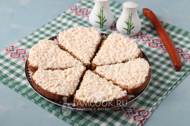 Полученную начинку нанести на ломтики хлеба. Начинки хватает на 6 ломтиков, осталось совсем немного, но я потом добавила туда оставшиеся желтки и крабовые палочки, немного майонеза, и получилось ещё два бутерброда, уже без украшения, которые тут же съели вместе с чаем.