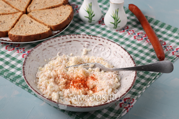 Хлеб по желанию можно подсушить в духовке, чтобы он был немного хрустящим. А в это время почистить яйца и отложить желтки. Белки натереть на тёрке. Добавить плавленый сырок и размять его вилкой.