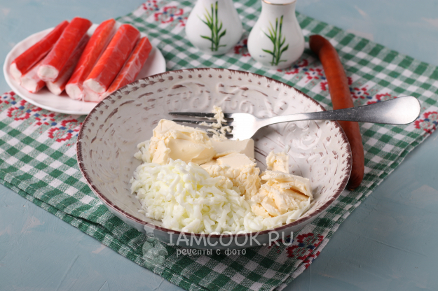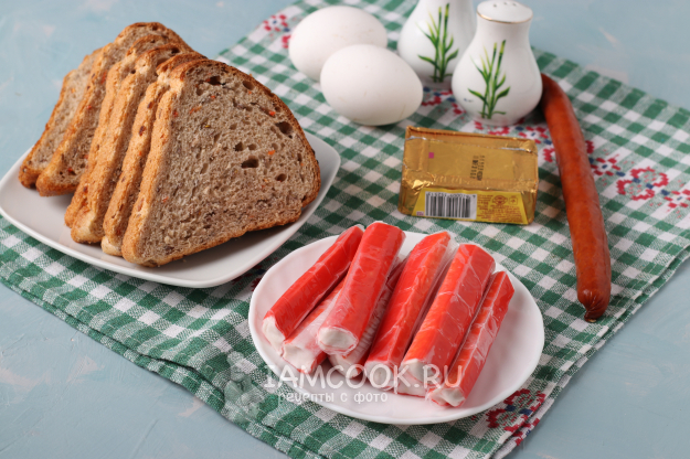 Для приготовления бутербродов «Мыши» с сыром, яйцом и крабовыми палочками подготовить из списка необходимые ингредиенты. Сварить предварительно яйца.