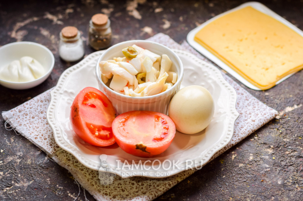 Подготовить продукты по списку. Кальмара можно использовать как вареного, так и маринованного.