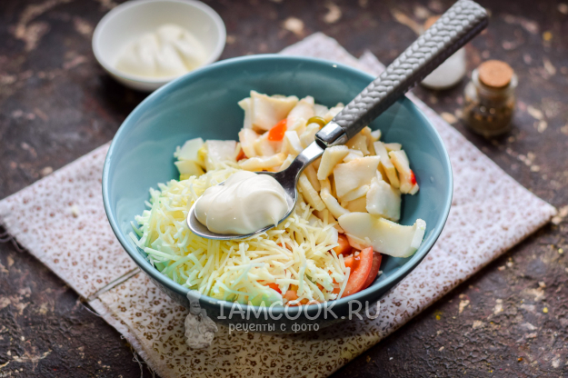 Заправить салат майонезом, соль и перец добавить на свое усмотрение. Перемешать ингредиенты и подавать к столу - салат «Красное море» с кальмарами готов к дегустации.