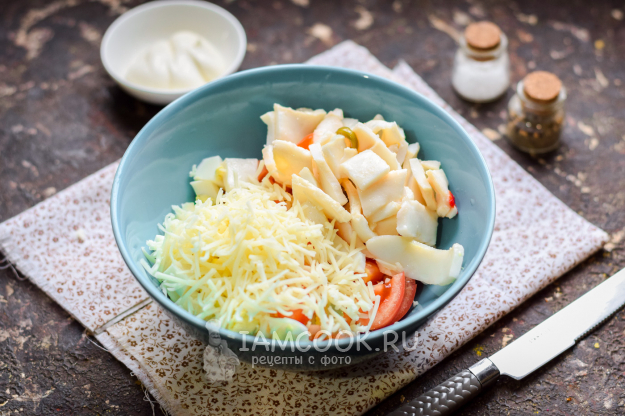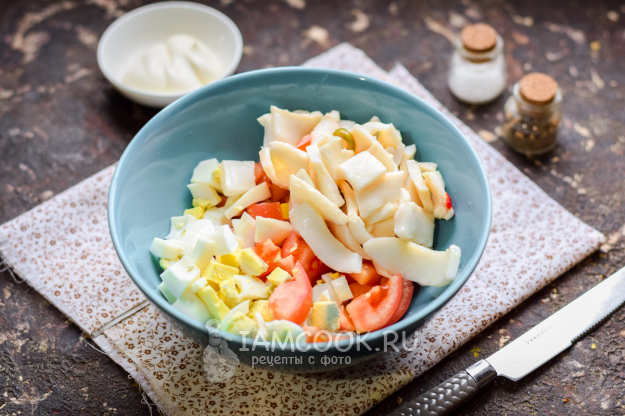 Сложить помидоры и яйца в салатник. Добавить сюда же нарезанного маринованного кальмара.