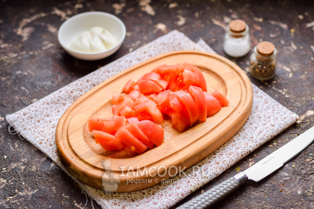 Помидоры выбрать вкусные, сполоснуть их и просушить. Нарезать помидоры небольшими кубиками.