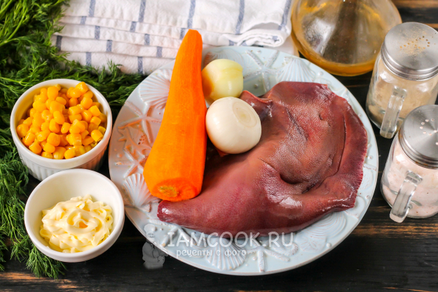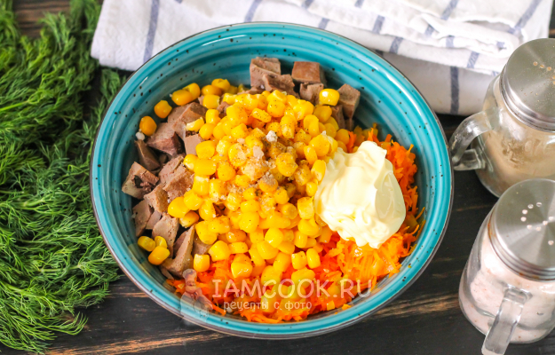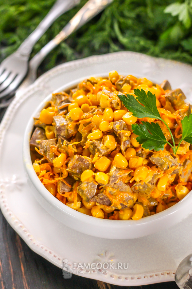 Кстати, в блюде есть вкусовой контраст сладкой консервированной кукурузы и терпкой, слегка горьковатой нотки вареной печени - это очень вкусно. По желанию в салат допустимо всыпать и измельченную зелень укропа, петрушки, но не кинзы, так как она перебьет аромат субпродукта - основного ингредиента.