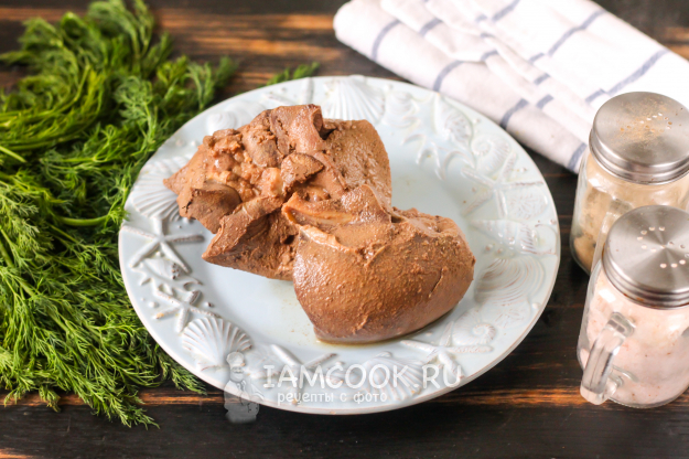 Свиную печень промойте в воде, отварите в течение 12-15 минут и остудите еще 5-6 минут, переместив в холодную воду или вынеся бульон с печенью на балкон. Затем срежьте с нее жилы.