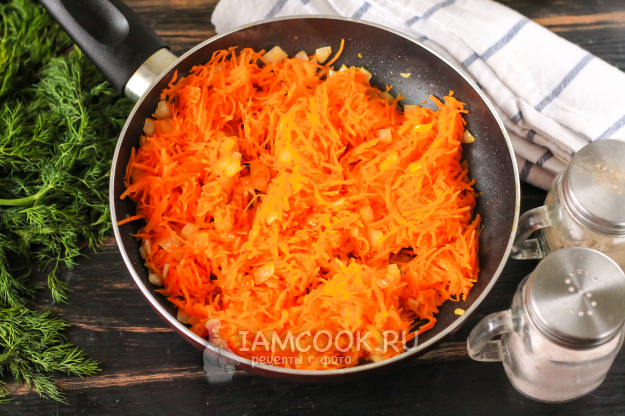 Очистите репчатый лук и морковь, промойте овощи в воде. Натрите морковь на терке с мелкими ячейками. Лук нарежьте мелким кубиком и пассеруйте все в растительном масле на сковороде около 5-6 минут, но не зажаривайте.