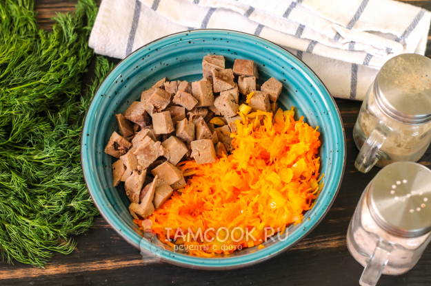 Остывшую печень нарежьте кубиками и высыпьте в емкость. Остывшую зажарку выложите в ту же емкость.