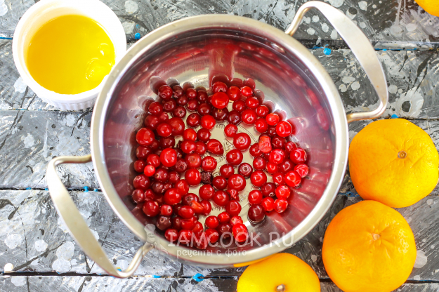 Промойте ягоды клюквы, удалите веточки и стебельки, высыпьте клюкву в кастрюлю.