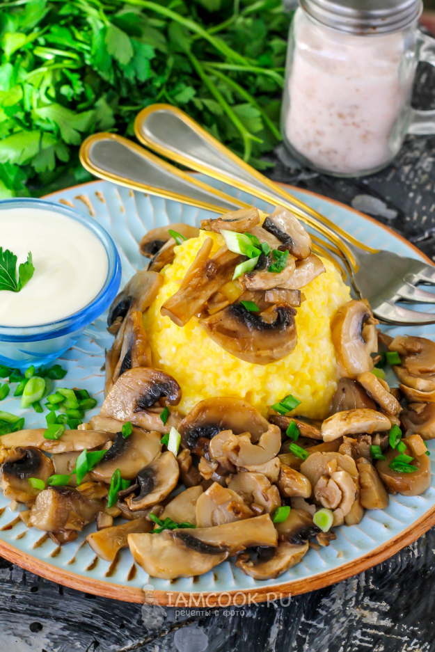 Выложите часть каши на тарелку, добавьте обжаренные грибы. Присыпьте все измельченным зеленым луком, предварительно промыв его. Не забудьте про соусы, соленья и т.д. Мамалыга с грибами готова к дегустации!