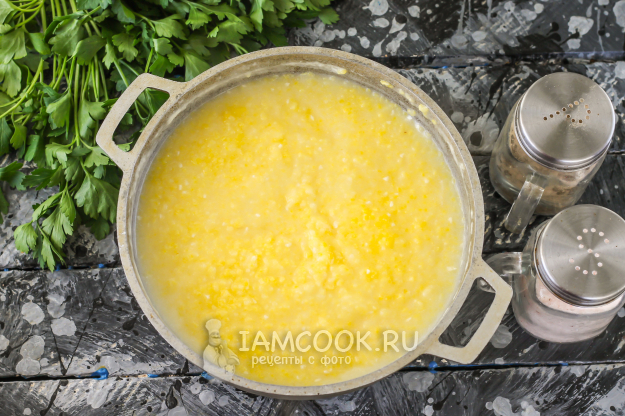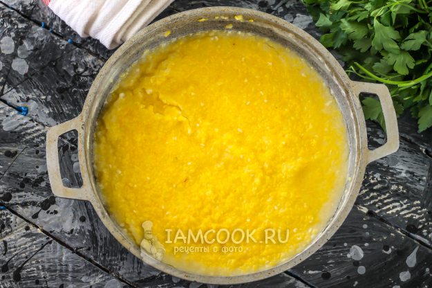 Каша варится обязательно в теплой воде, забеленной сметаной любой жирности. По желанию сметану можно заменить сливками. Многие готовят мамалыгу на воде, вмешивая в жидкость свиной или гусиный смалец. Главное - каша должна быть жирной, наваристой!