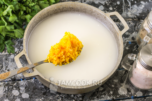 Промойте кукурузную крупу в воде, выложите в кипящую воду. Отварите на минимальном нагреве примерно 10-12 минут и выключите его.