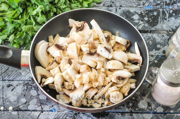 В это время промойте шампиньоны в воде, нарежьте ломтиками. Прогрейте на плите сковороду с растительным маслом и выложите в емкость грибную нарезку.