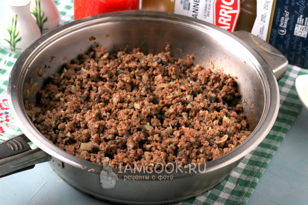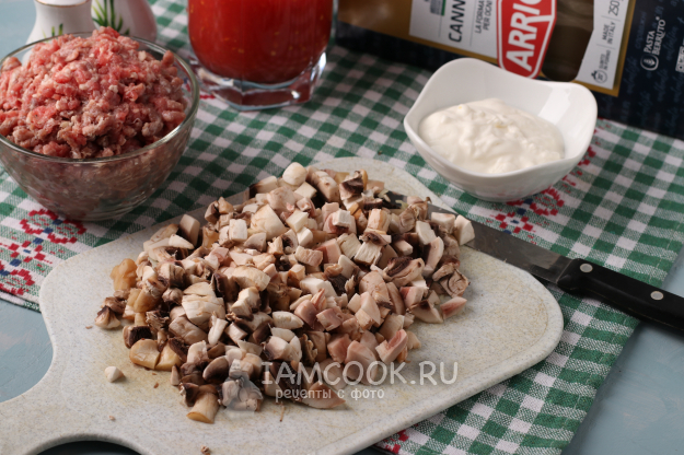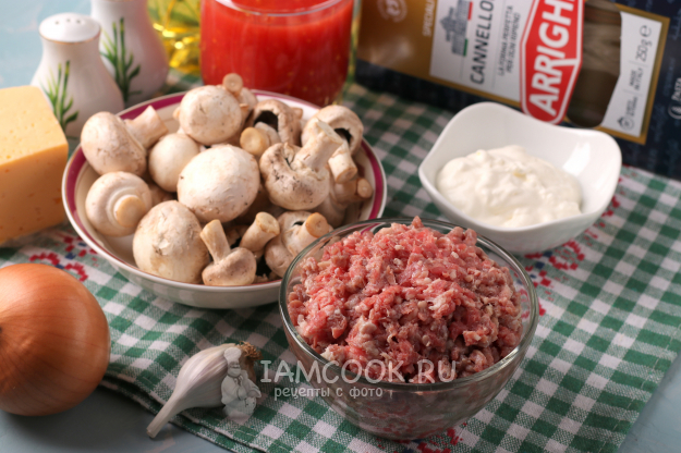 Для приготовления каннеллони с фаршем и грибами в томатно-сметанном соусе подготовить из списка необходимые ингредиенты.