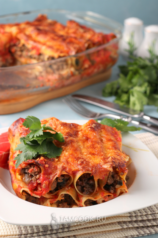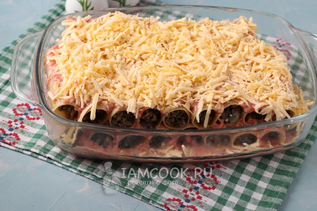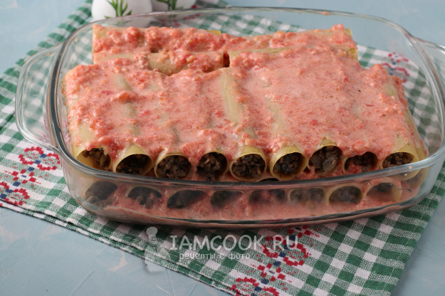 Духовку разогреть до 180 градусов и готовить каннеллони 30-35 минут, пока хорошо не зарумянится сыр.