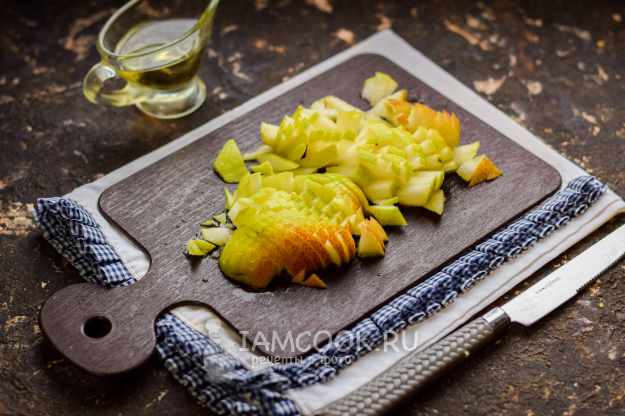 Грушу вымыть и просушить, нарезать небольшими кубиками.
