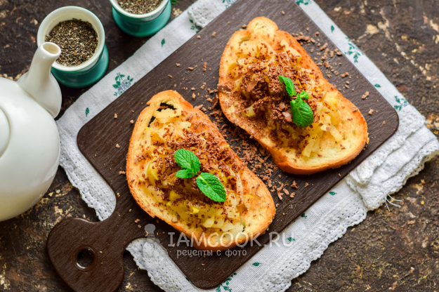 Посыпать гренки шоколадной стружкой. Подавать к столу с чаем или молоком.