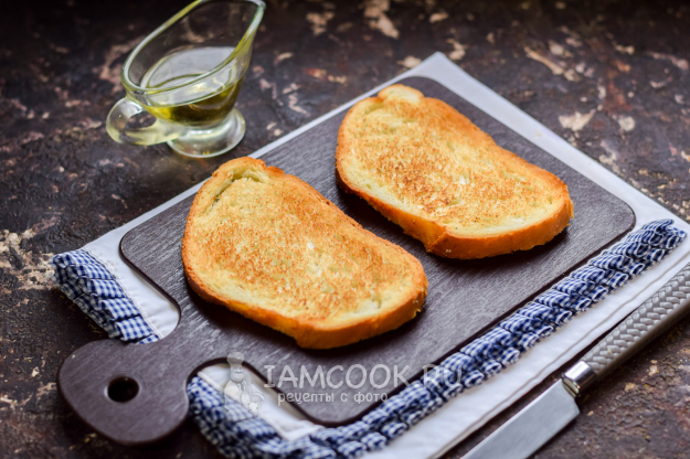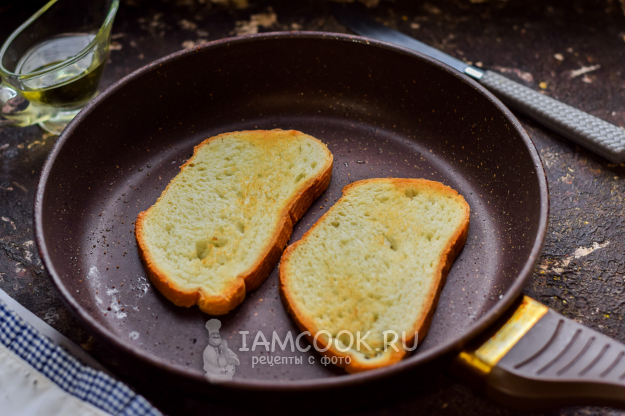 Сковороду разогреть, подсушить на сковороде несколько ломтиков батона, поджарить с обеих сторон до румяности.