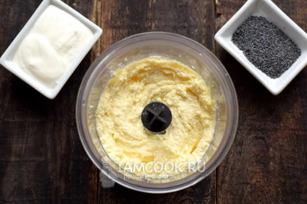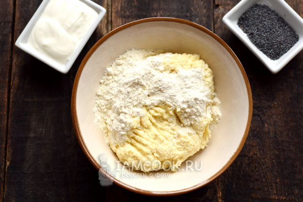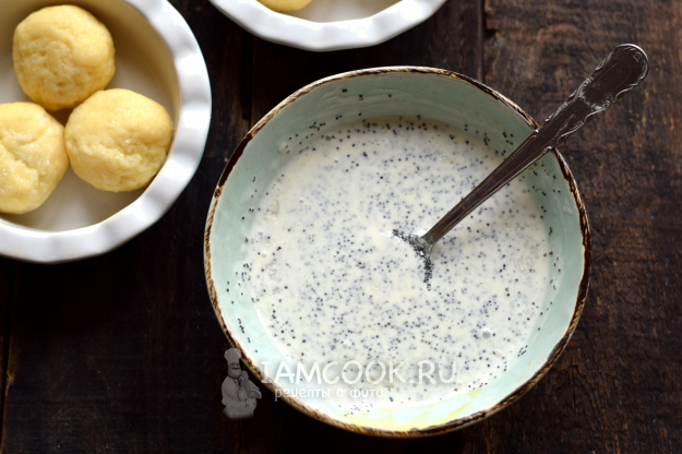Отдельно приготовьте соус, смешав сметану, сахар и мак. Соус тщательно перемешайте, дайте постоять 10 минут, чтобы сахар полностью растаял, а мак немного набух.